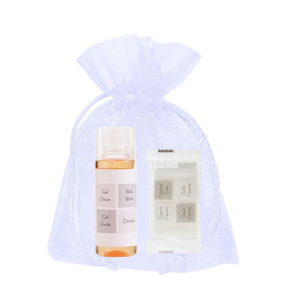 Il Kit di Benvenuto Linea Neutra, confezionato in eleganti sacchetti di organza, è la soluzione ideale per hotel, B&B e strutture ricettive che desiderano offrire un’accoglienza sobria, versatile e di qualità.