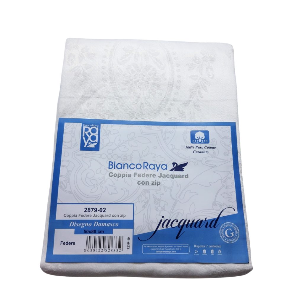 Le federe “Blanco Raya” sono un set di due federe in puro cotone di alta qualità, progettate con un elegante motivo damasco jacquard. Queste federe sono disponibili in una dimensione standard di 50×80 cm, che le rende adatte per cuscini di dimensioni comuni.