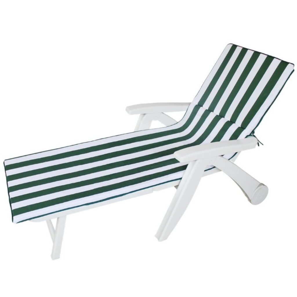 Il design rigato dona un tocco elegante e fresco, facilmente abbinabile a qualsiasi stile di arredo outdoor. Inoltre, il cuscino è dotato di laccetti robusti e pratici: due centrali e quattro alle estremità, che consentono un ancoraggio stabile sia alla seduta che allo schienale del lettino, evitando fastidiosi scivolamenti o pieghe.