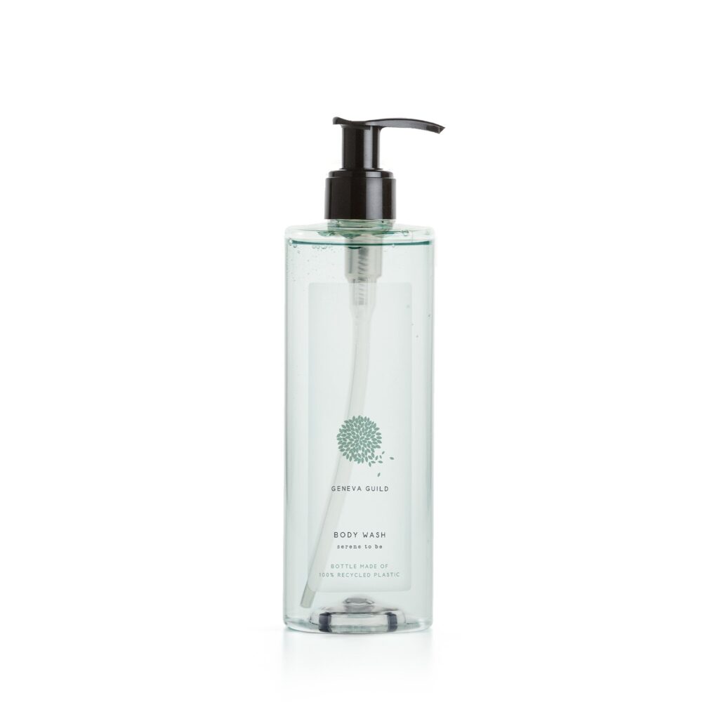 Gel doccia / bagnoschiuma in dispenser ricaricabile della linea Geneva Guild. Deterge delicatamente la pelle, con estratto di Aloe Vera.