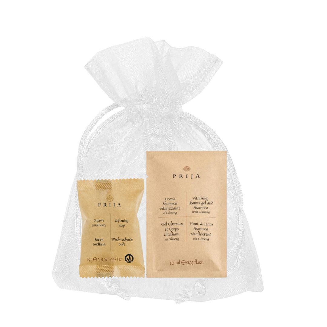 Offri ai tuoi ospiti un’accoglienza raffinata con il Kit di Benvenuto Prija, confezionato in eleganti sacchetti di organza. Perfetto per hotel, B&B e strutture ricettive che vogliono distinguersi per qualità e attenzione ai dettagli.