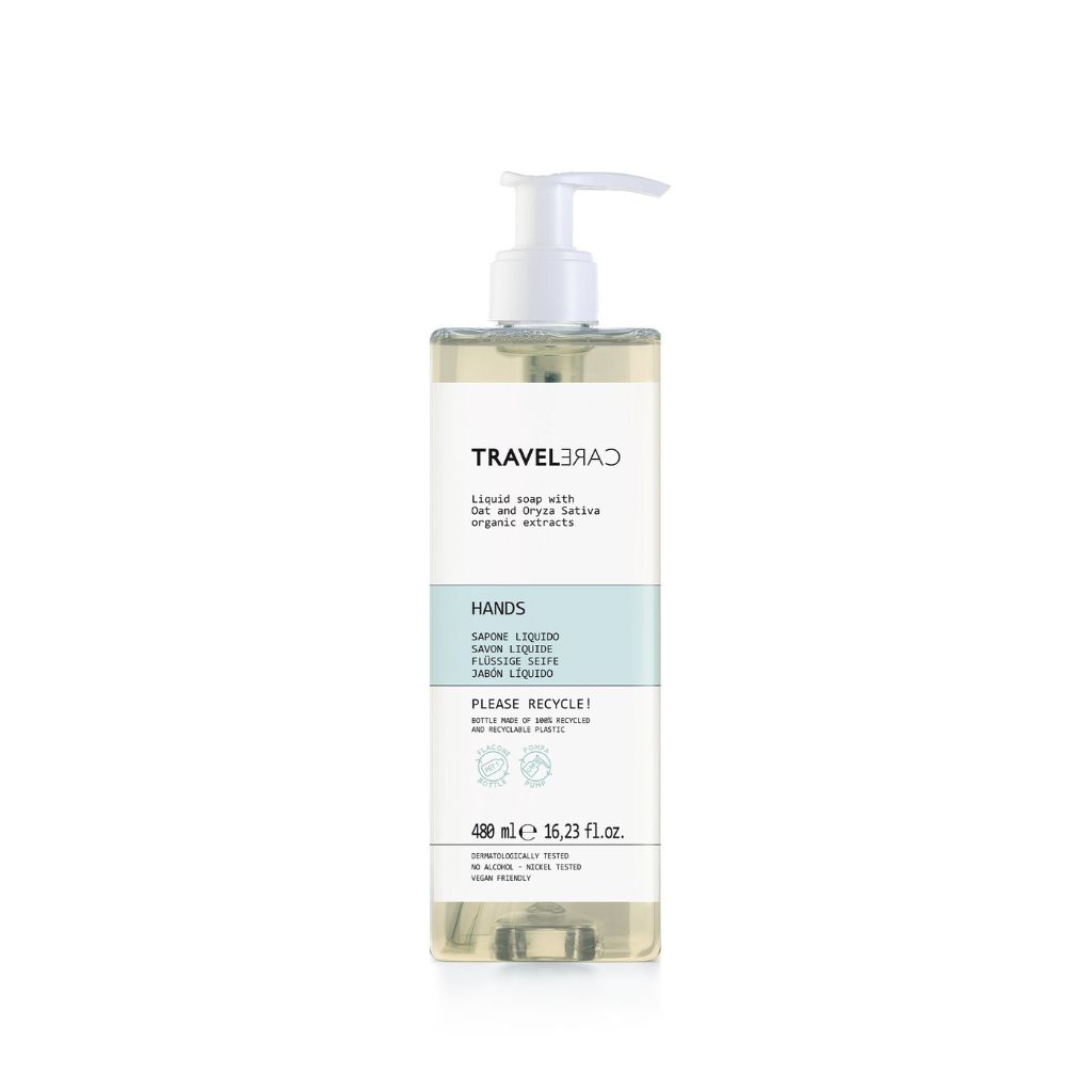 Il sapone liquido Travelcare è arricchito con estratti biologici di avena e oryza sativa, per detergere delicatamente e mantenere i capelli sempre in condizioni ottimali.