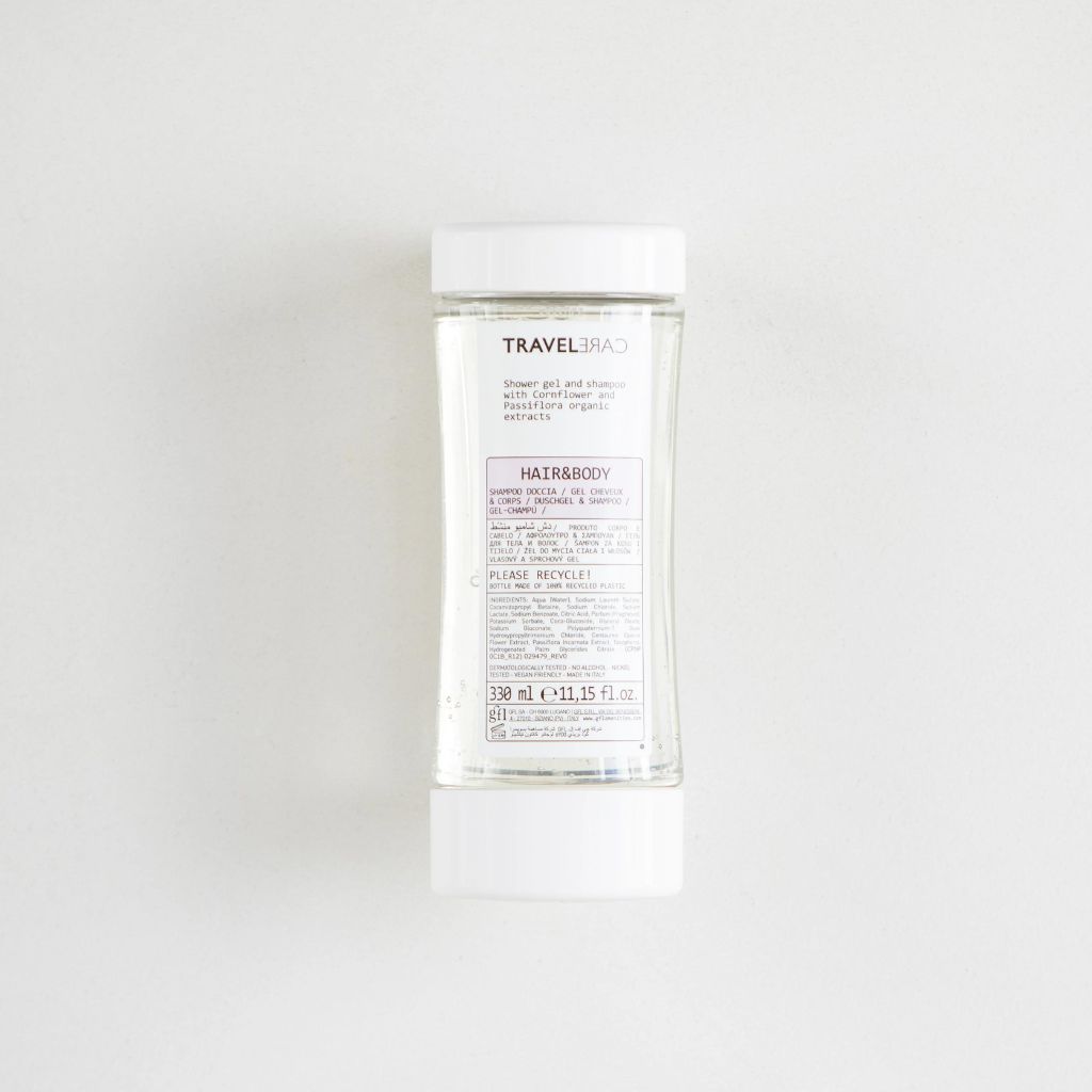 Il sapone liquido Travelcare è arricchito con estratti biologici di avena e oryza sativa, per detergere delicatamente e mantenere i capelli sempre in condizioni ottimali.