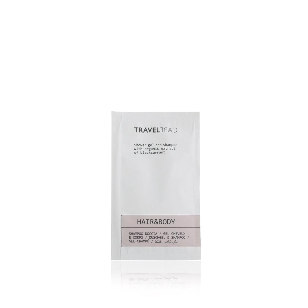 Travelcare shampoo doccia è arricchito con estratto biologico di Ribes Nero. Bustina 10 ml.