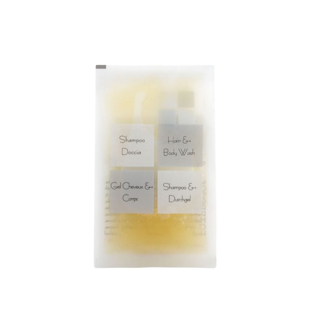 BUSTINA 12 ML CM 6 X 10 DI SHAMPOO-DOCCIA GIALLO TRASPARENTE IN ACCOPPIATO TRASP. SATINATO